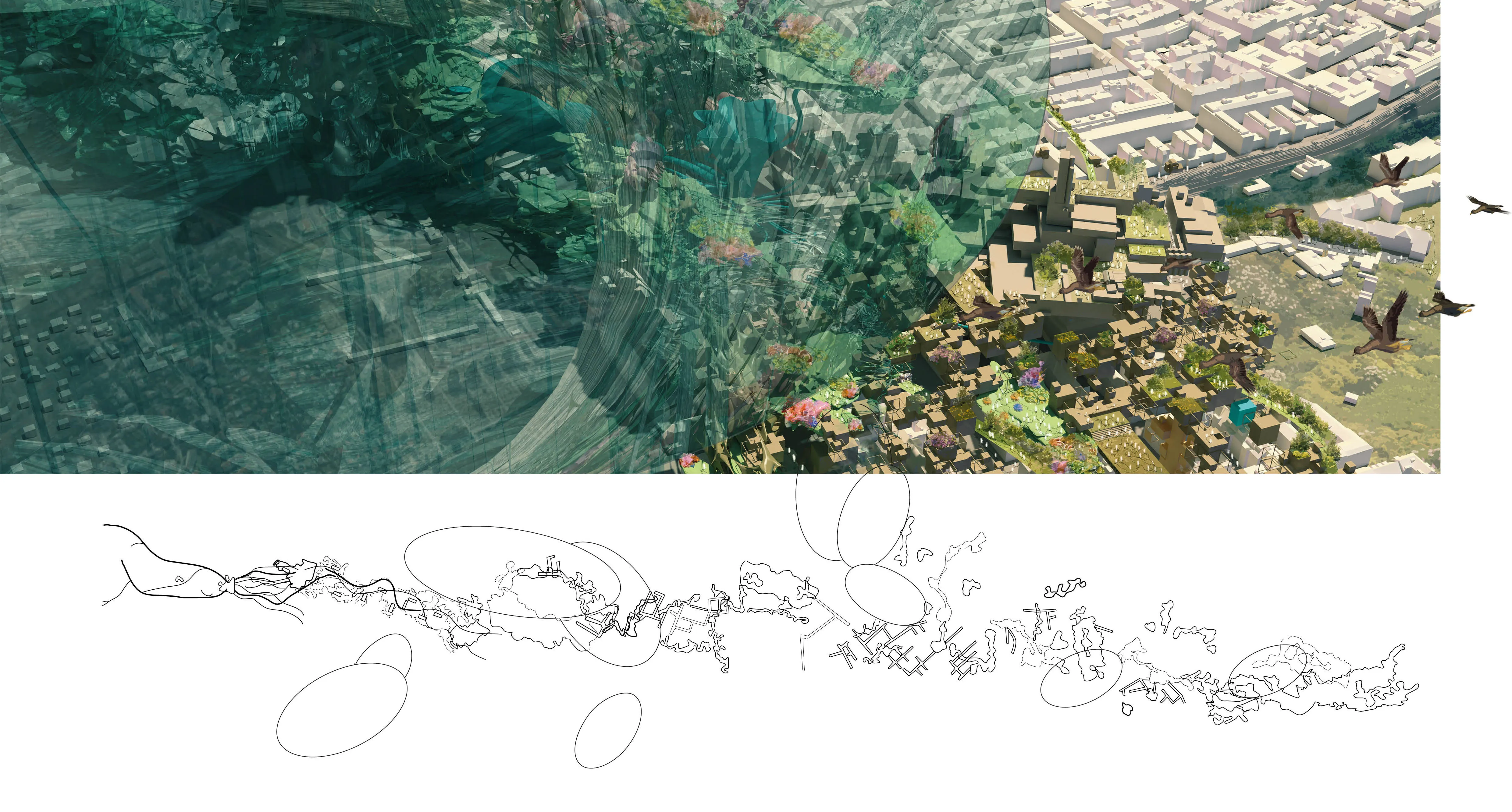 RAUMPARK – Faux Terrain Vienna is an ecological mega-structure reconnecting nature with urban life. Stretching 12 kilometers, it links Vienna's western Biosphere Park Wienerwald to the eastern Prater and Nationalpark Donau-Auen, creating a green corridor over the city. RAUMPARK provides spaces for homes, recreation, agriculture, and trade, integrating forests, gardens, and parks to cool the city and improve air quality. Designed for all species, including humans, it adapts to its environment using recyclable materials and evolves to meet future needs. The project fosters a sustainable way of living, balancing population growth with preserving nature.